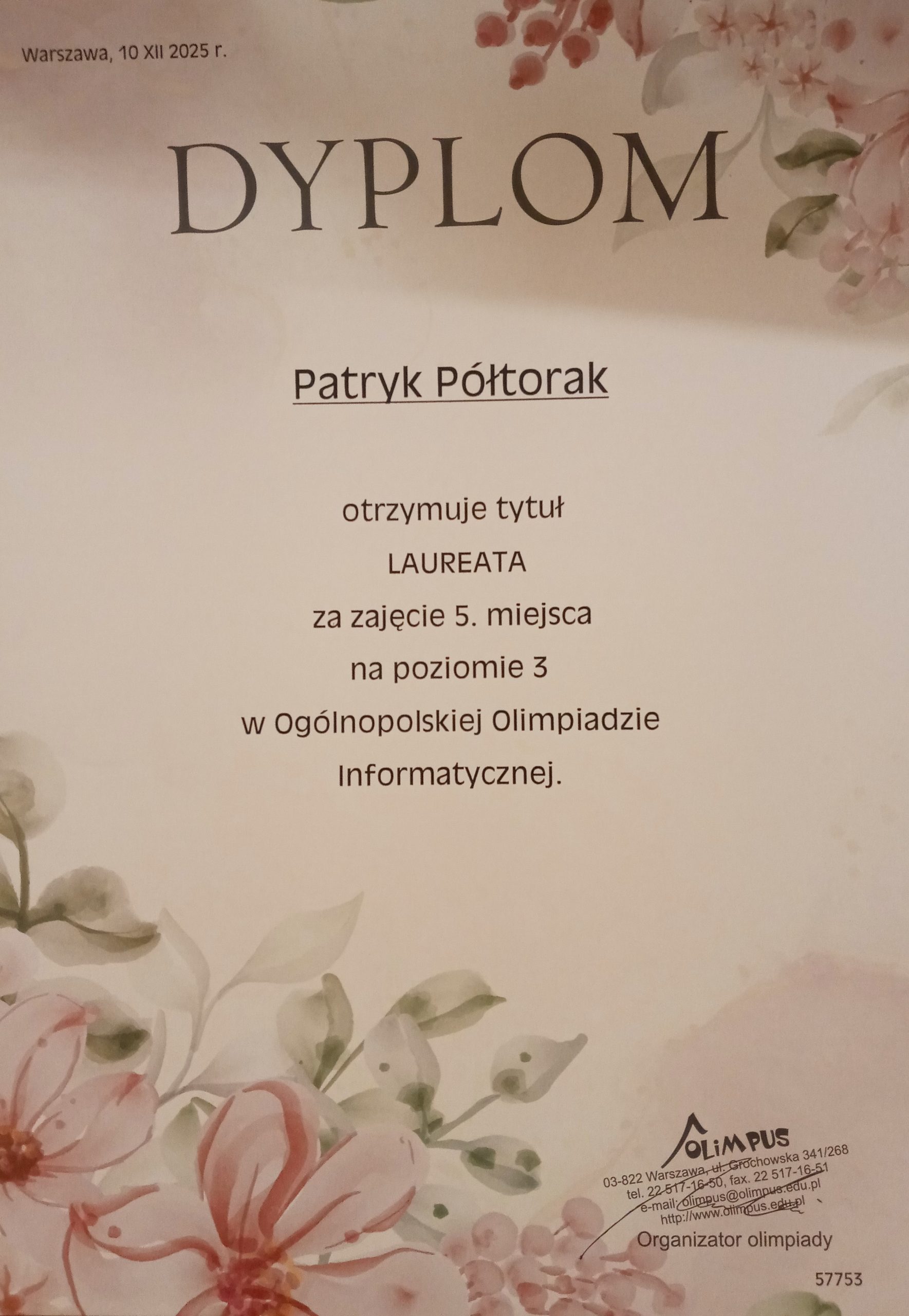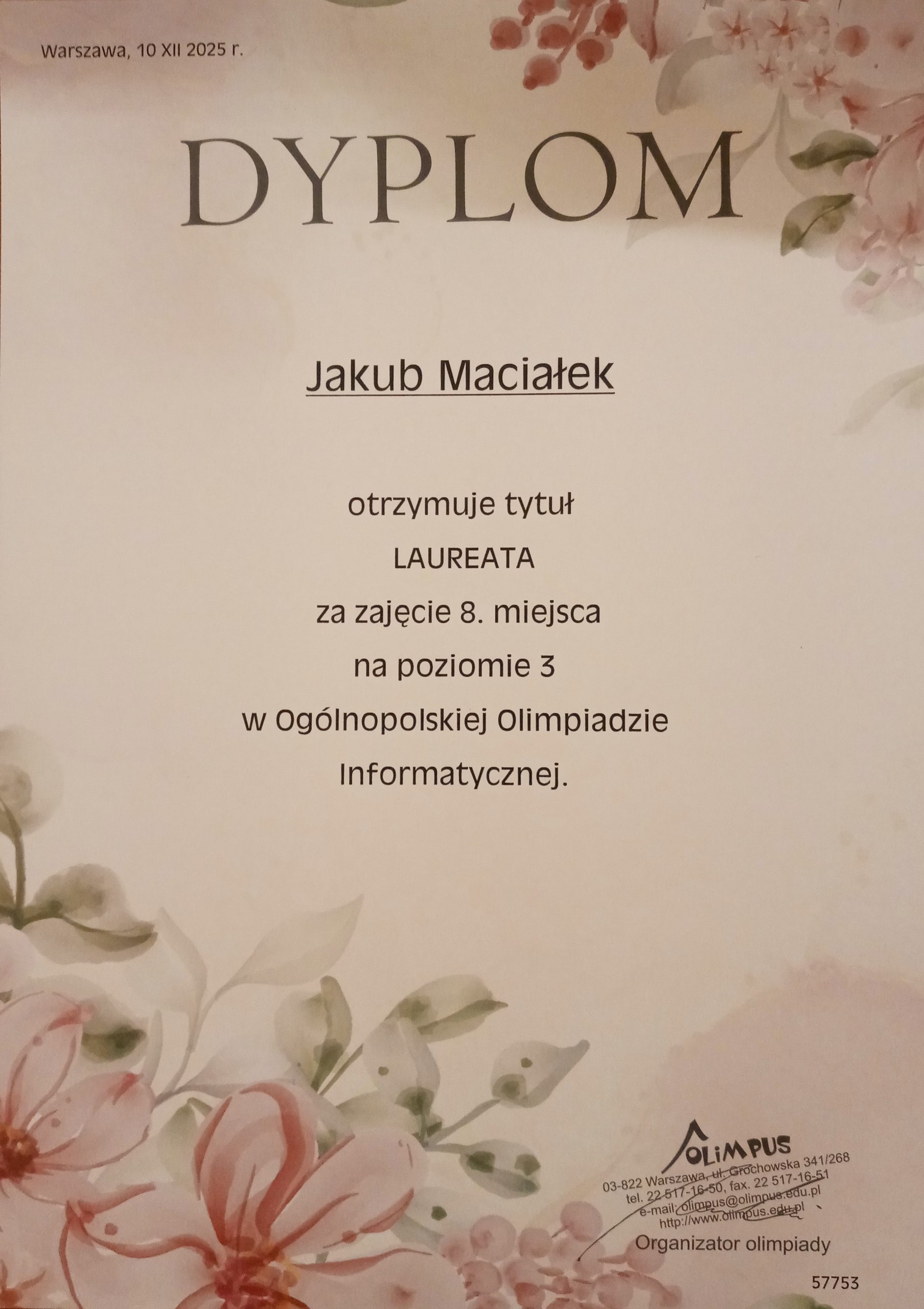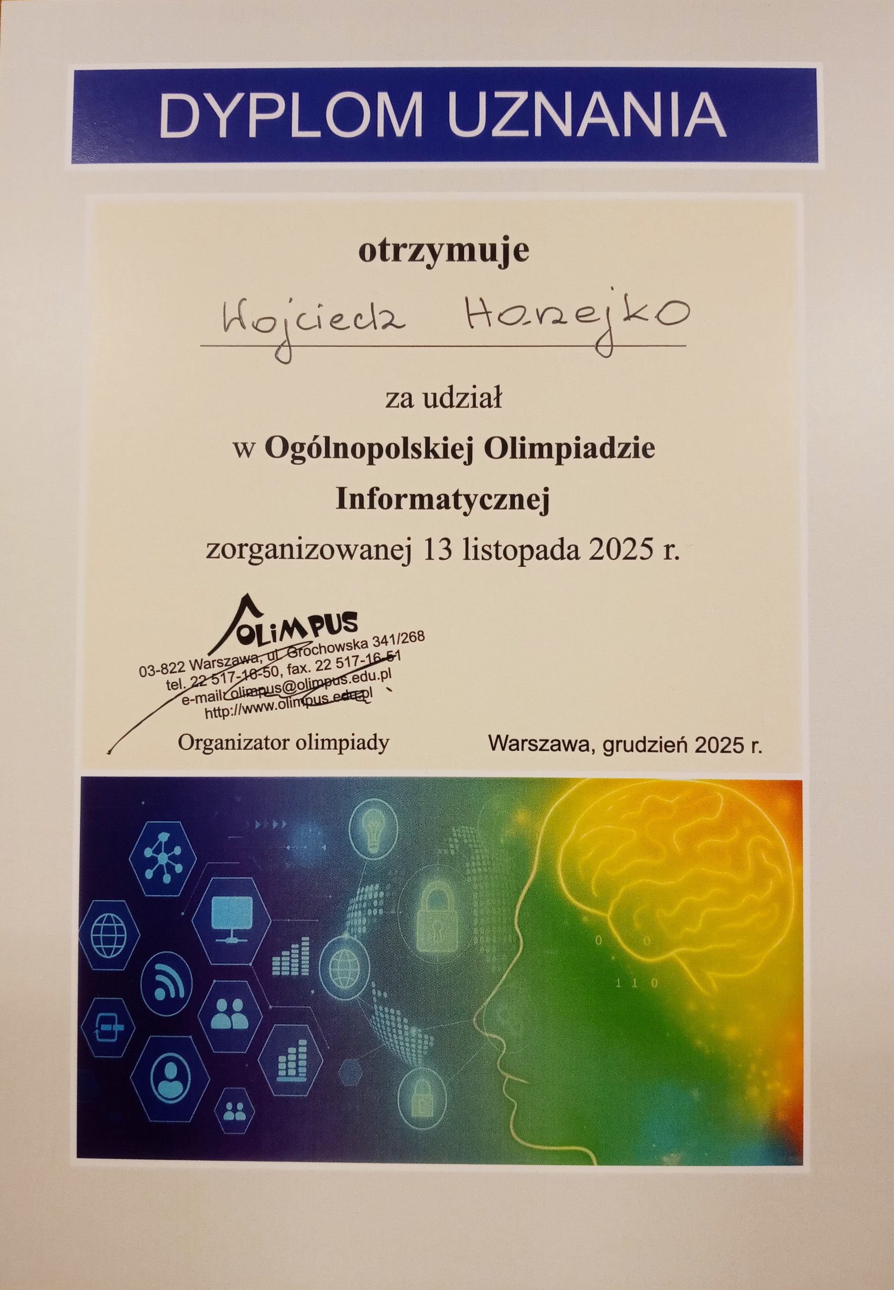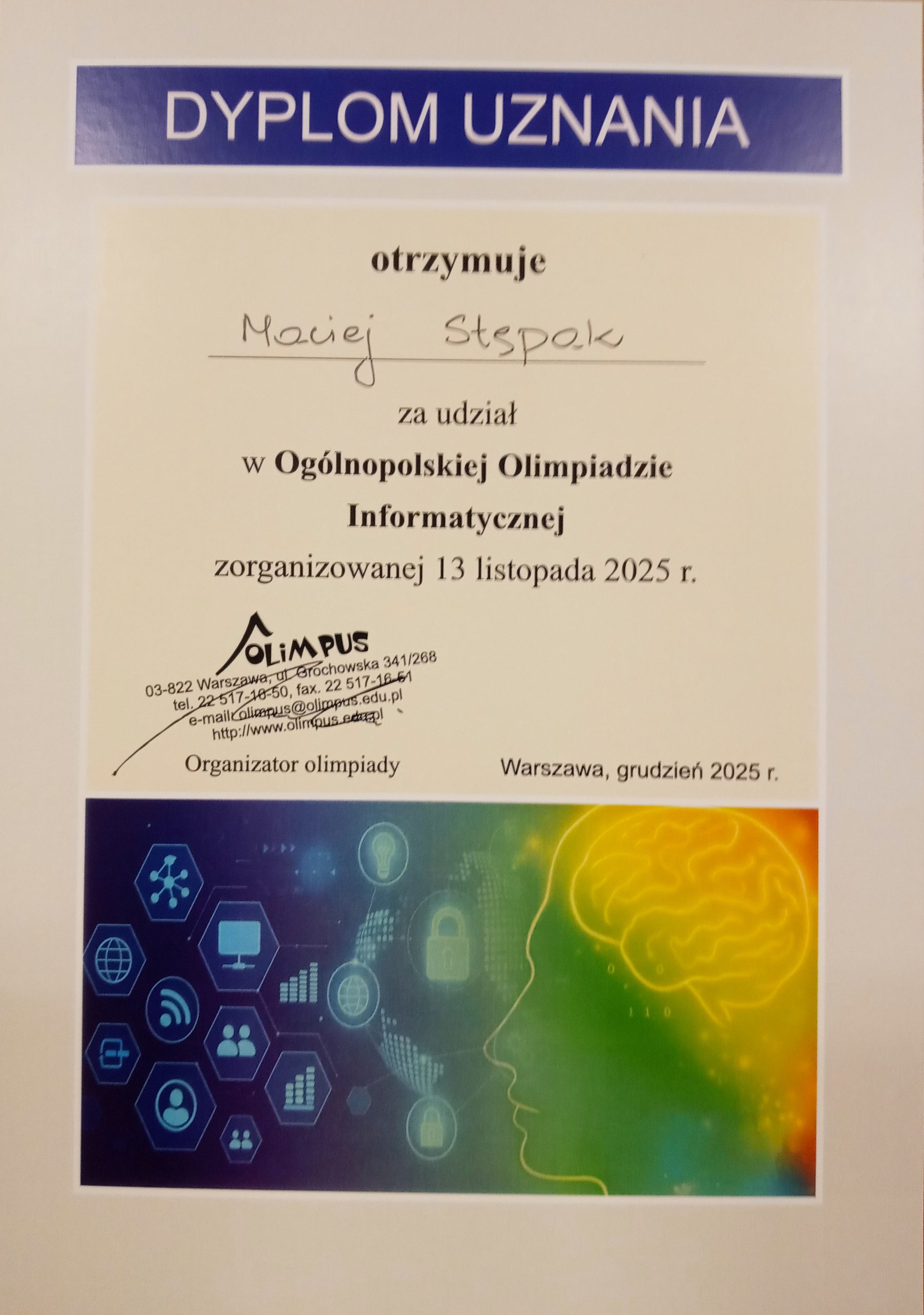 Z ogromną dumą informujemy, że 9 uczniów Naszej szkoły zdobyło tytuł laureata Ogólnopolskiej Olimpiady Informatycznej OLIMPUS. To znakomite osiągnięcie jest potwierdzeniem wysokiego poziomu wiedzy informatycznej, zaangażowania oraz pasji naszych uczniów do nowych technologii.