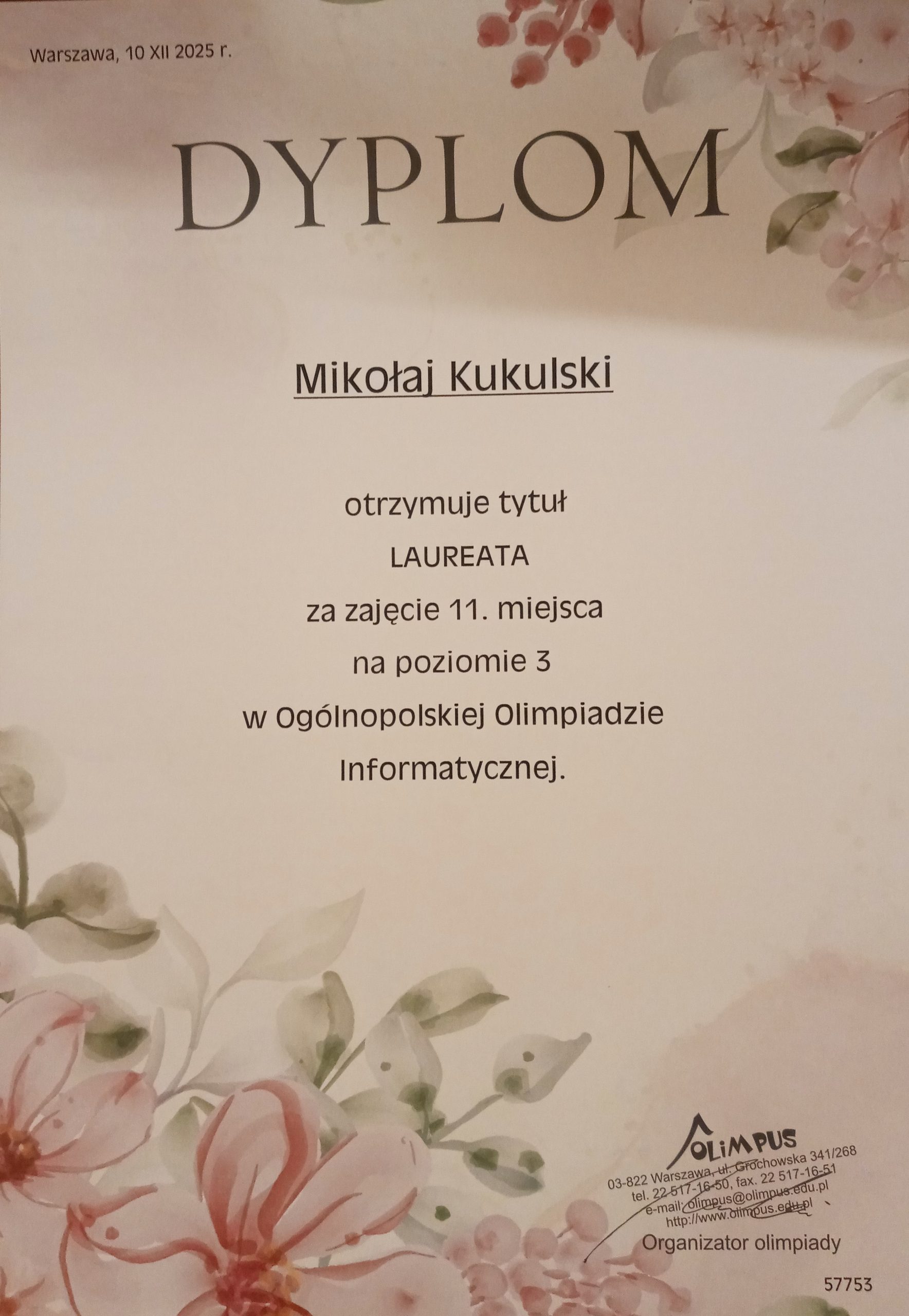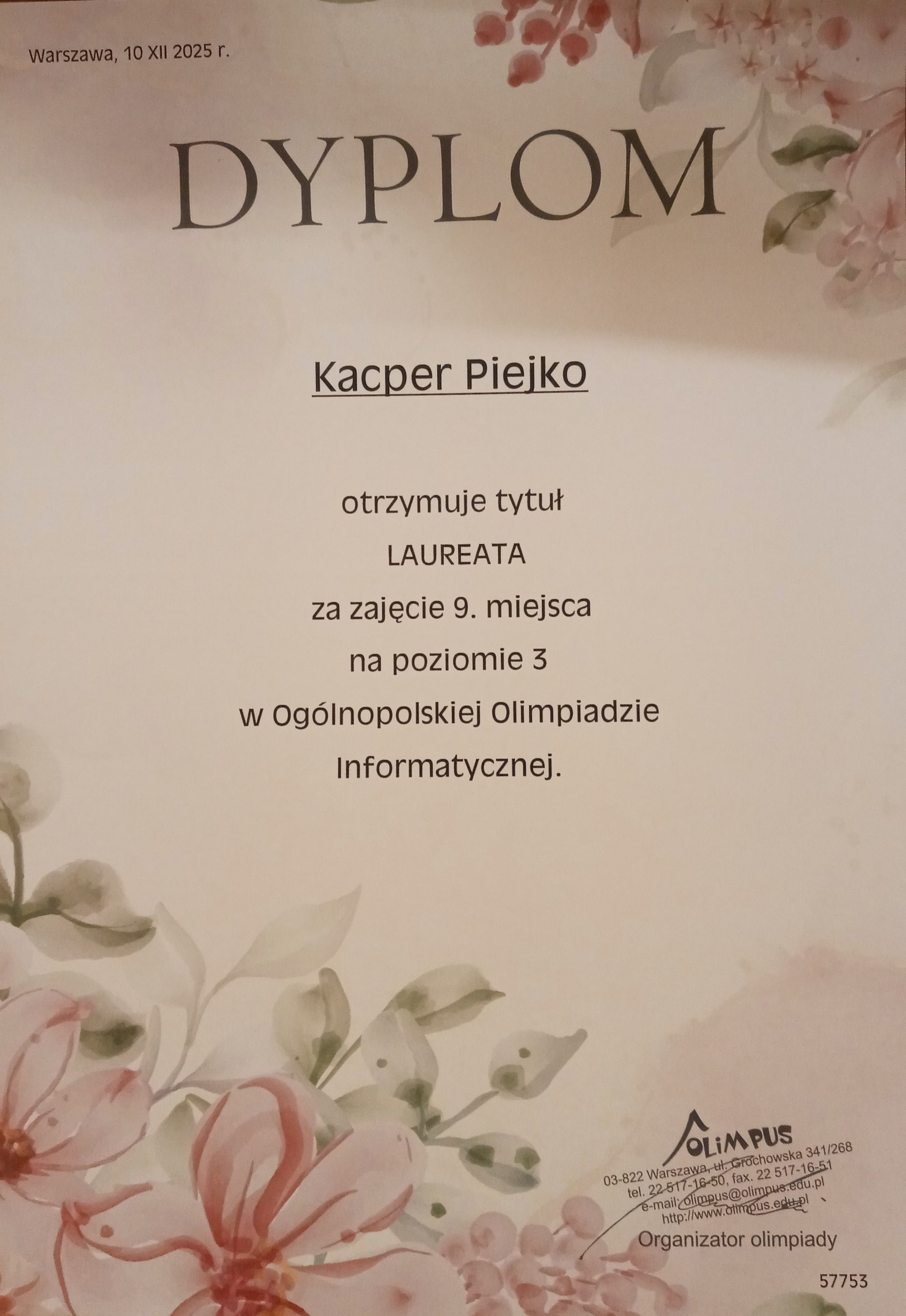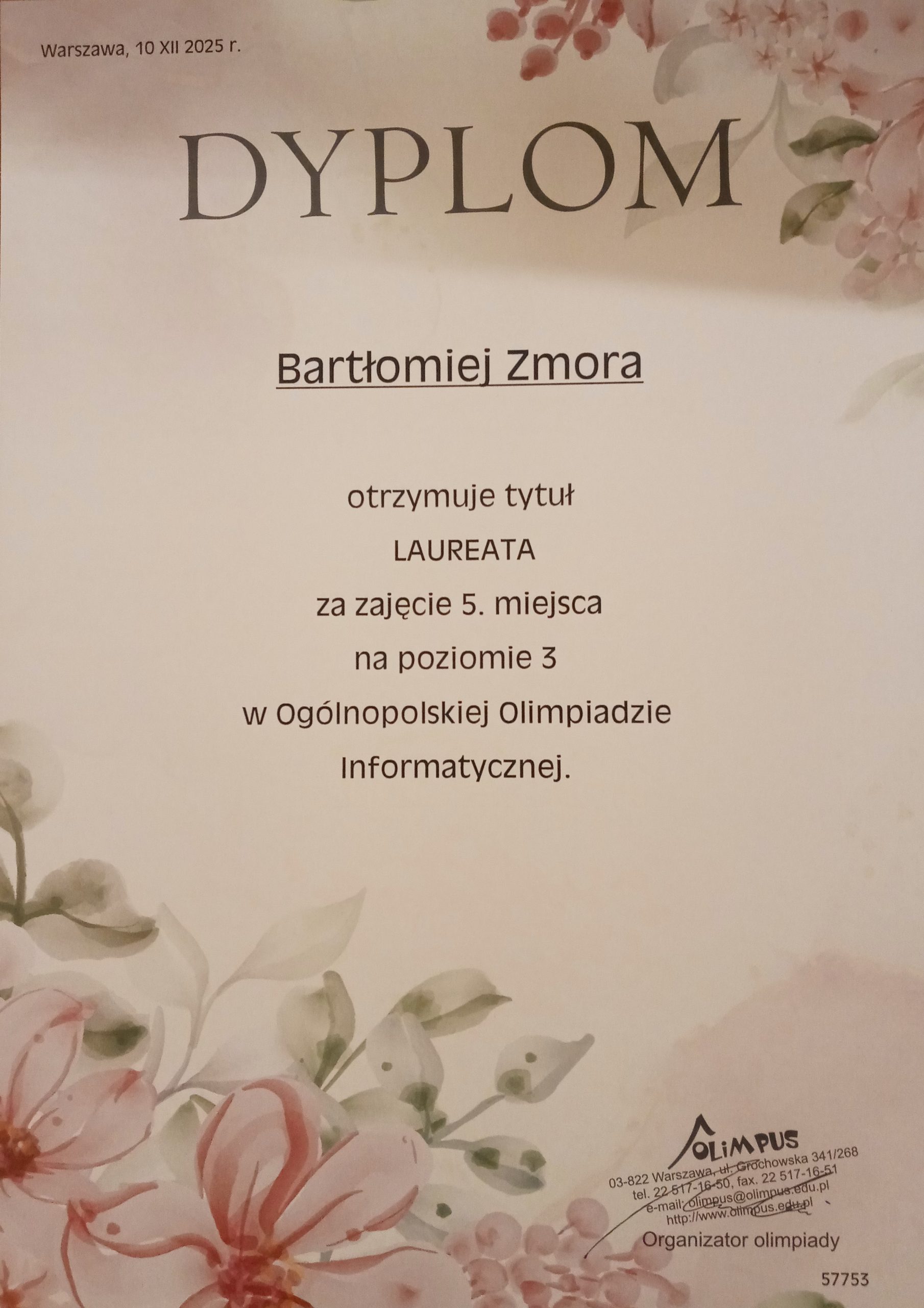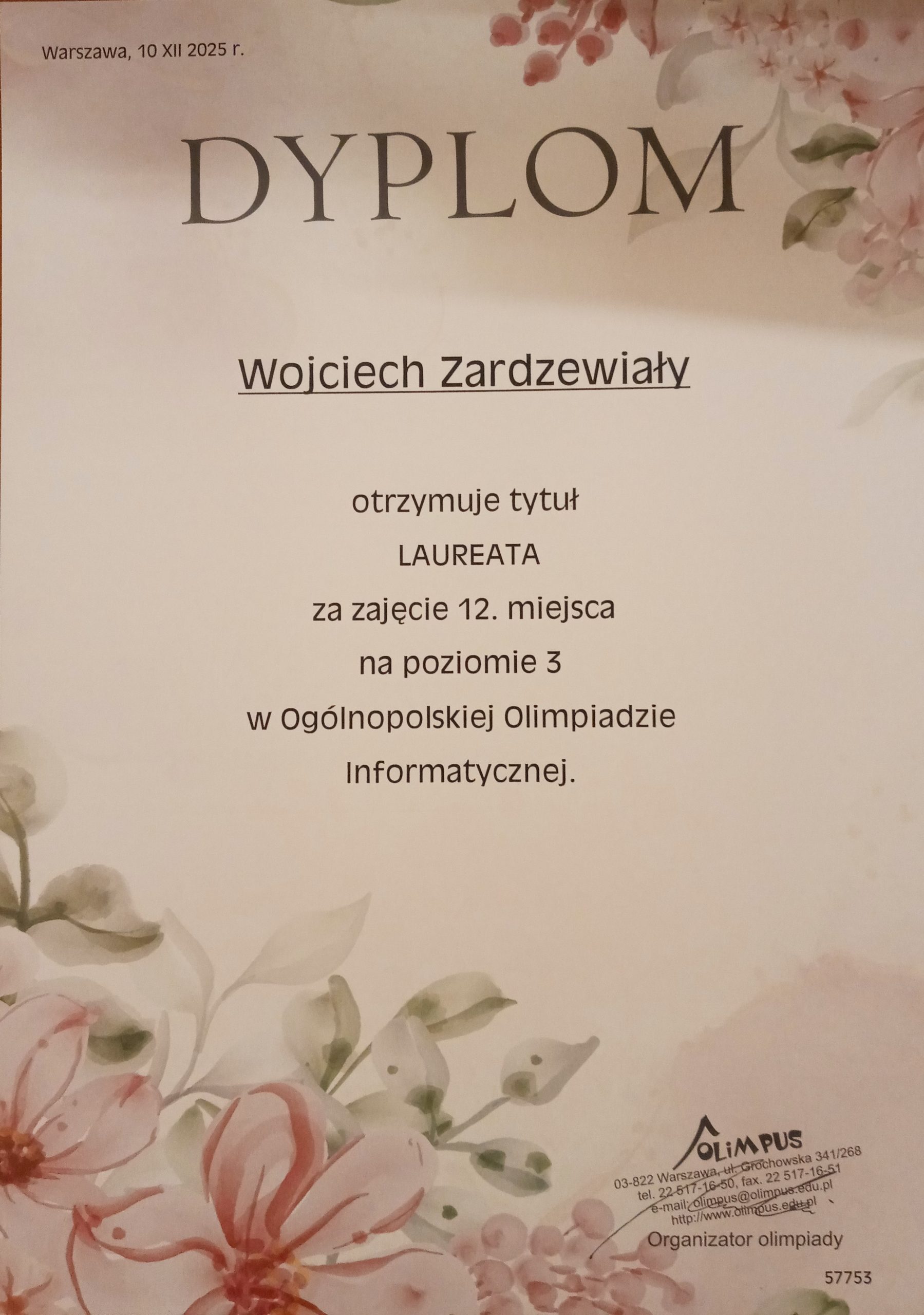 Z ogromną dumą informujemy, że 9 uczniów Naszej szkoły zdobyło tytuł laureata Ogólnopolskiej Olimpiady Informatycznej OLIMPUS. To znakomite osiągnięcie jest potwierdzeniem wysokiego poziomu wiedzy informatycznej, zaangażowania oraz pasji naszych uczniów do nowych technologii.