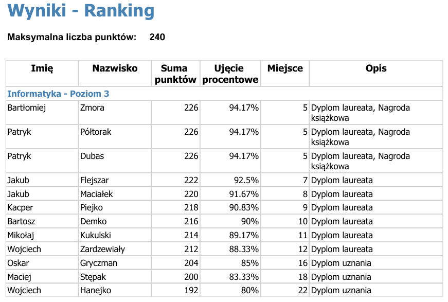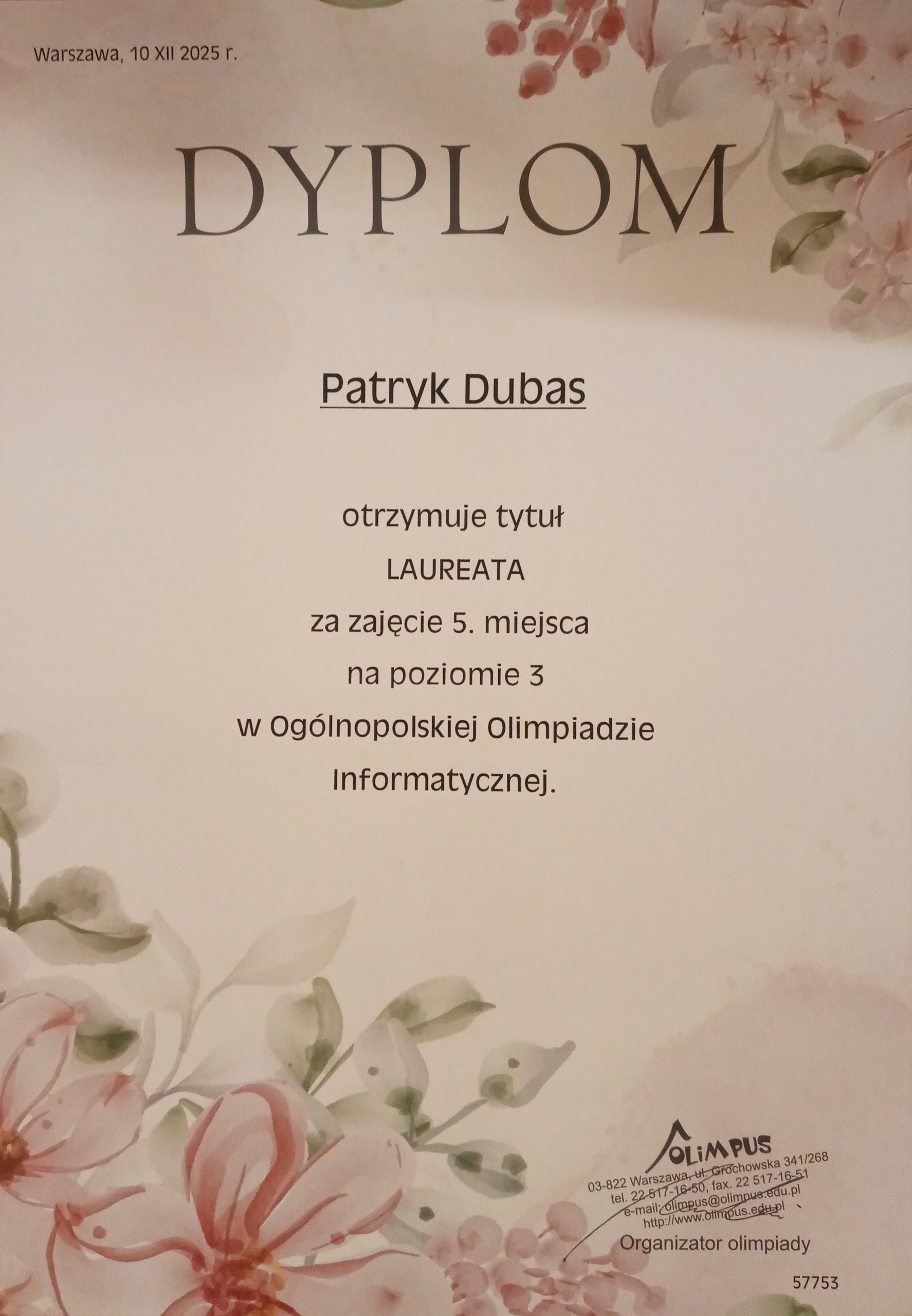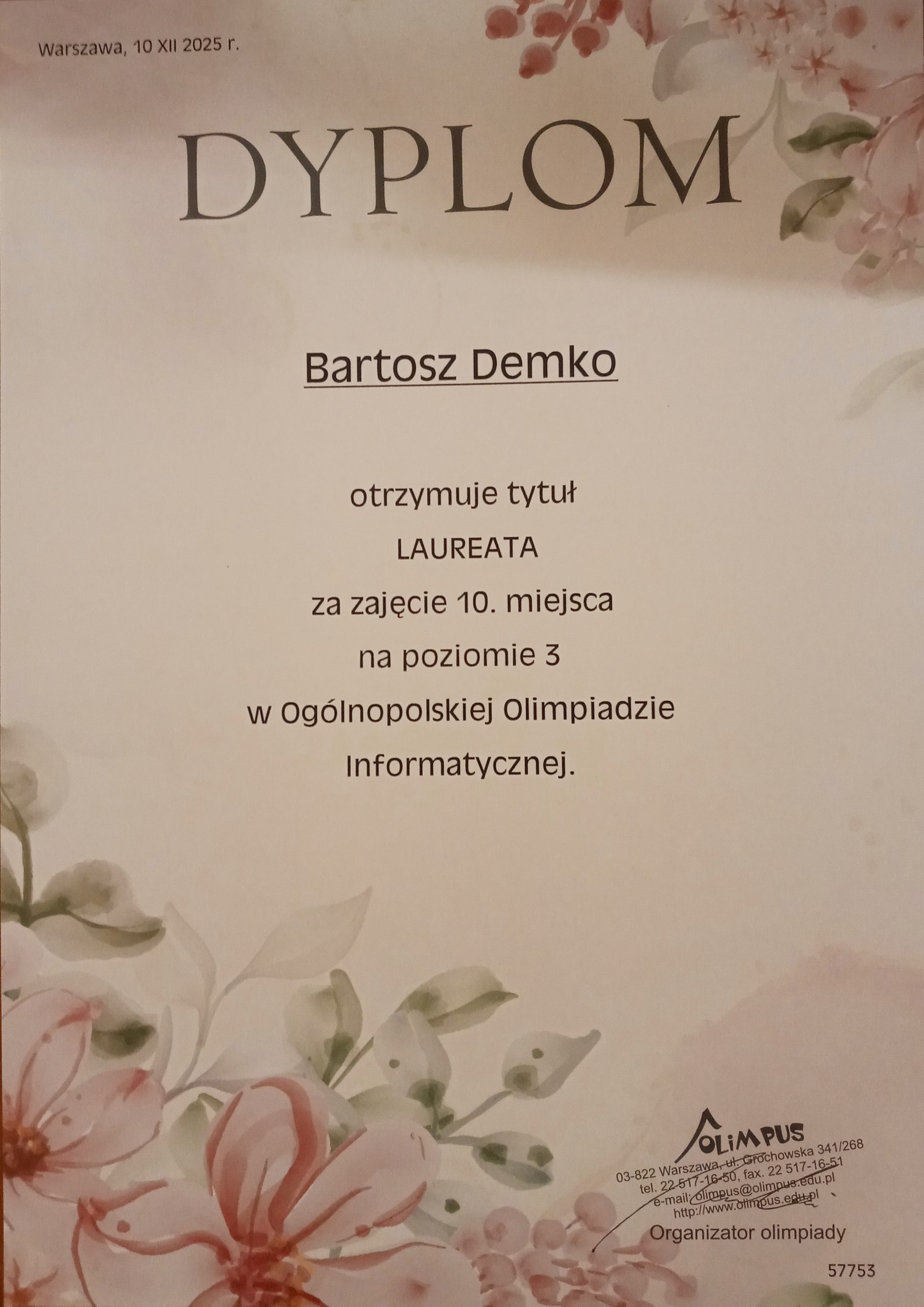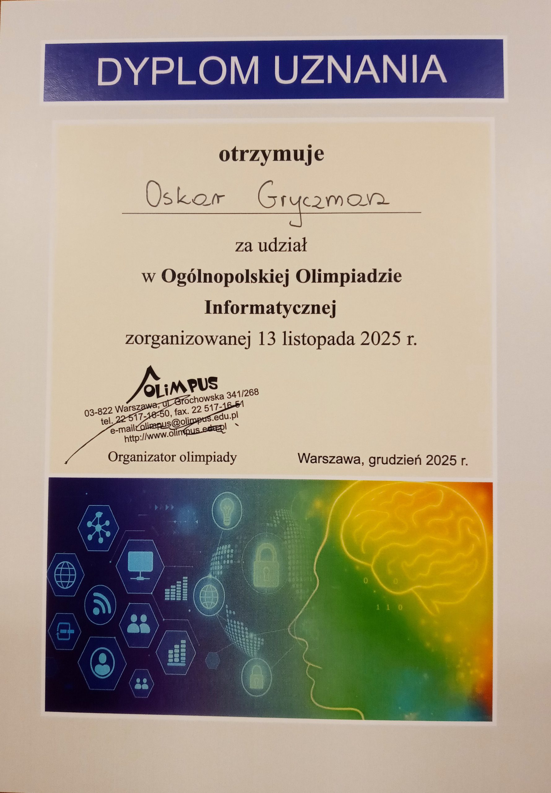 Z ogromną dumą informujemy, że 9 uczniów Naszej szkoły zdobyło tytuł laureata Ogólnopolskiej Olimpiady Informatycznej OLIMPUS. To znakomite osiągnięcie jest potwierdzeniem wysokiego poziomu wiedzy informatycznej, zaangażowania oraz pasji naszych uczniów do nowych technologii.