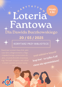 W czwartek 20 marca 2025 r. Samorząd Uczniowski zorganizował charytatywną loterię fantową dla Dawida Buczkowskiego z klasy 2mk. Jakiś czas temu u Dawida zdiagnozowano mięsaka Erwinga z przerzutami do płuc, co poskutkowało amputacją jednej z nóg chłopaka. Uczniowie chętnie wzięli udział w loterii, pomagając przy tym koledze. Gadżety zostały ufundowane przez Starostwo Powiatowe w Przeworsku oraz Samorząd Uczniowski ZSZ w Przeworsku.
