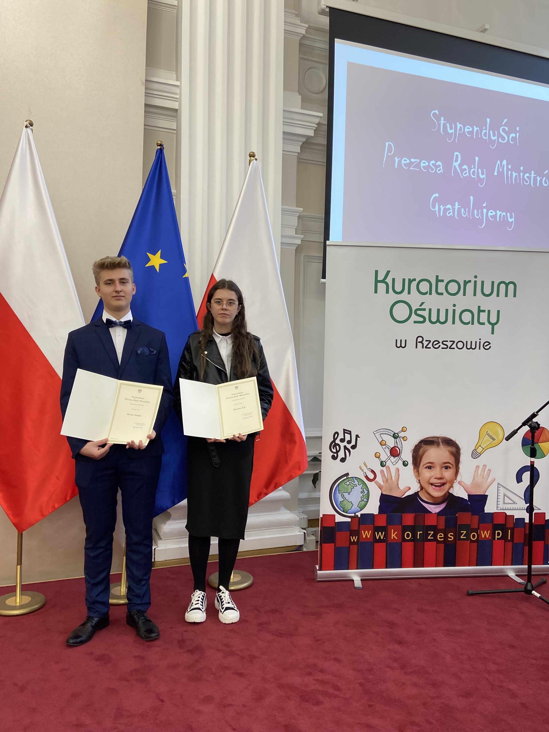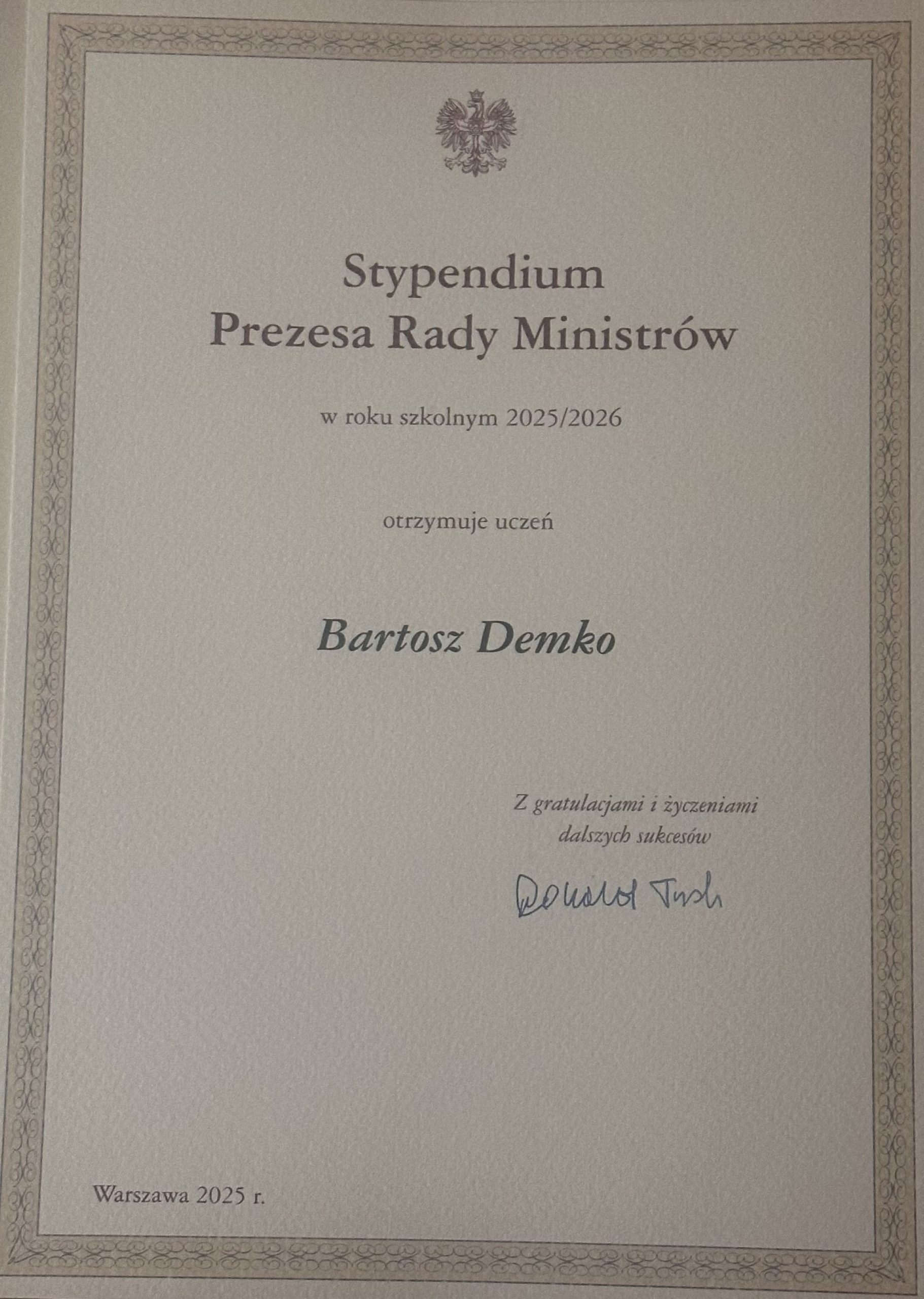 W roku szkolnym 2025/2026 stypendium Prezesa Rady Ministrów otrzymali: Bartosz Demko – 3I, Martyna Żak – 4LOa.