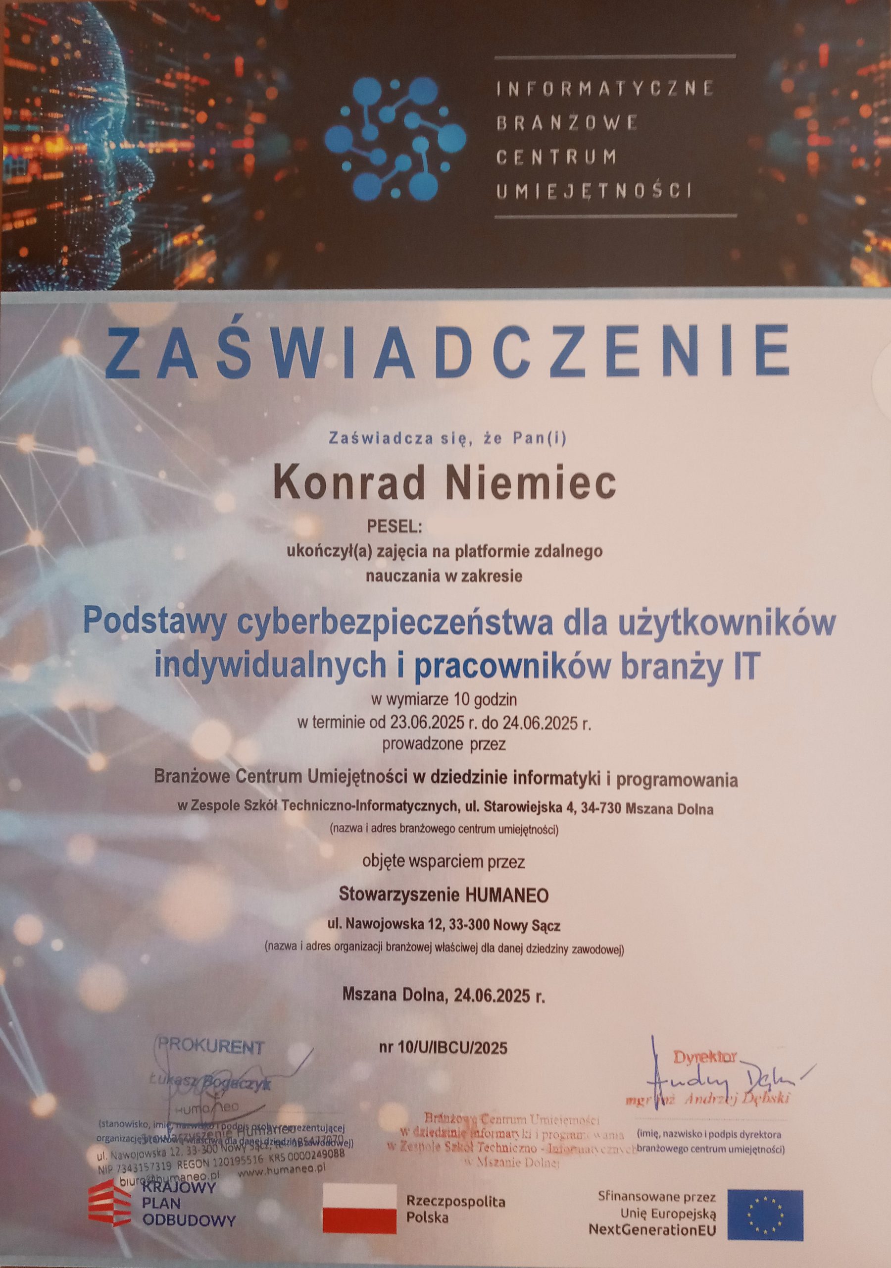 W dniach od 23.06-24.06.2025 r. na platformie zdalnego nauczenia odbyło się specjalistyczne 10 godzinne szkolenie z zakresu „Podstaw cyberbezpieczeństwa dla użytkowników indywidualnych i pracowników branży IT” prowadzone przez Branżowe Centrum Umiejętności w dziedzinie informatyki i programowania w Mszanie Dolnej objęte wsparciem przez Stowarzyszenie HUMANEO. Wydarzenie miało na celu podniesienie kompetencji cyfrowych uczestników w zakresie ochrony danych, bezpiecznego korzystania z Internetu oraz reagowania na zagrożenia w przestrzeni cyfrowej.
