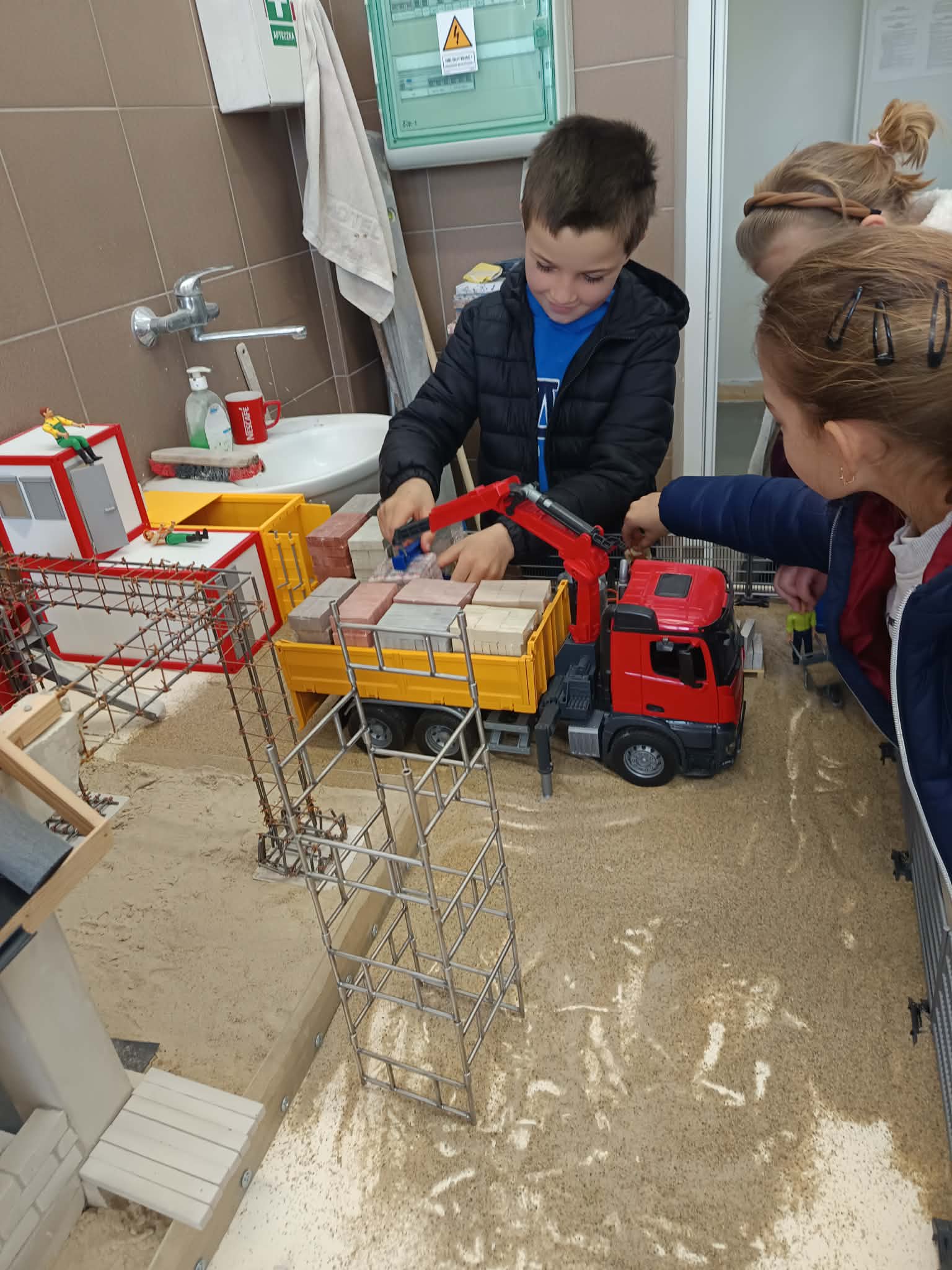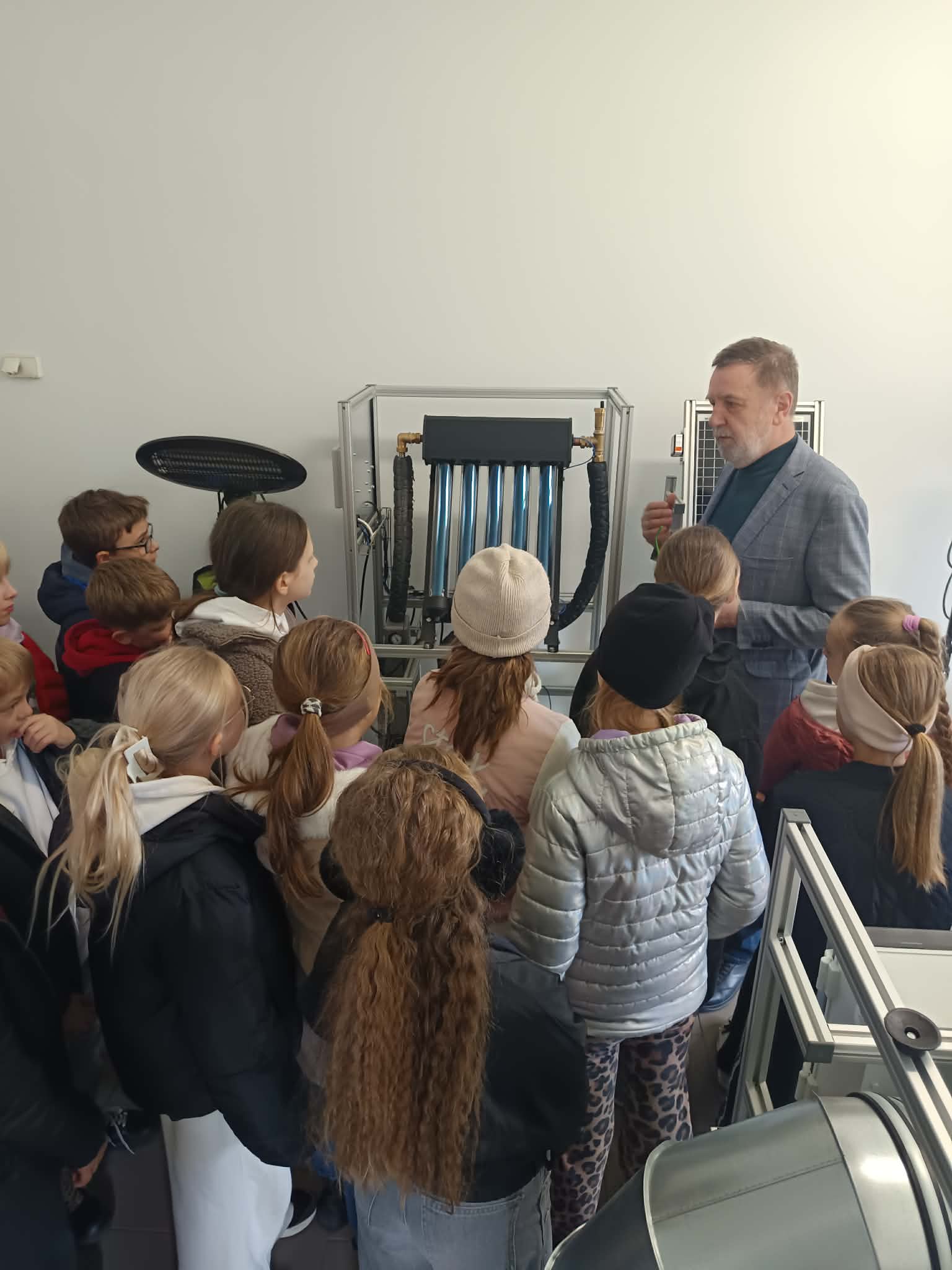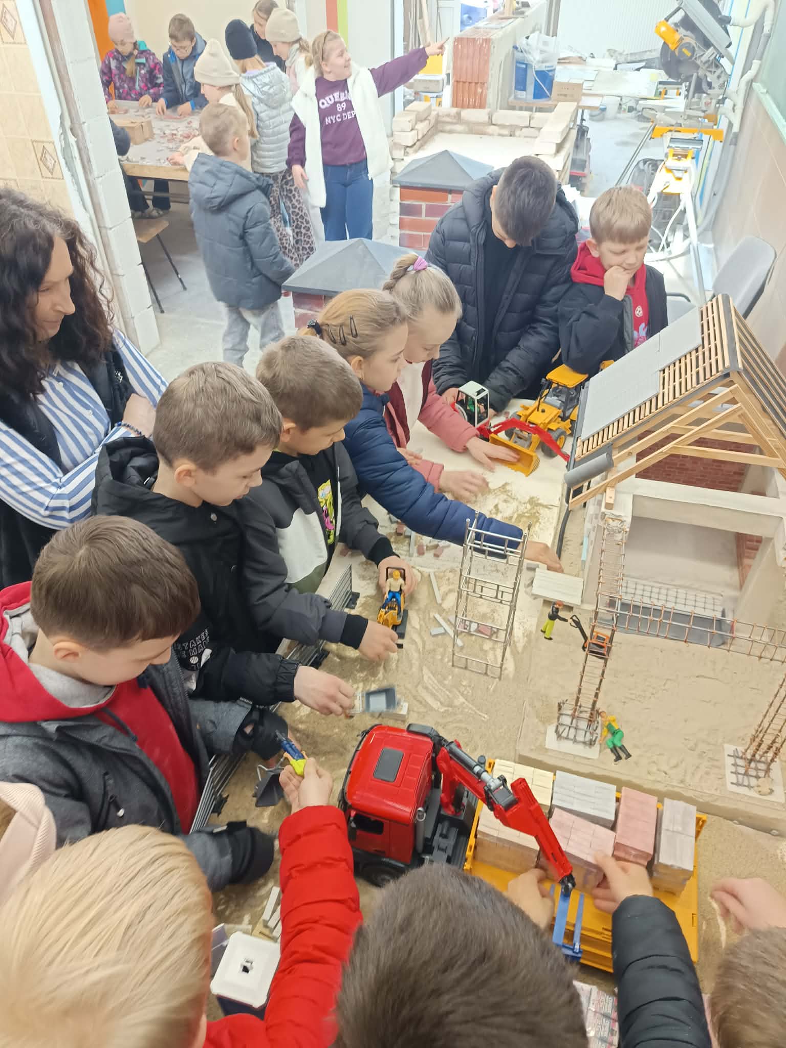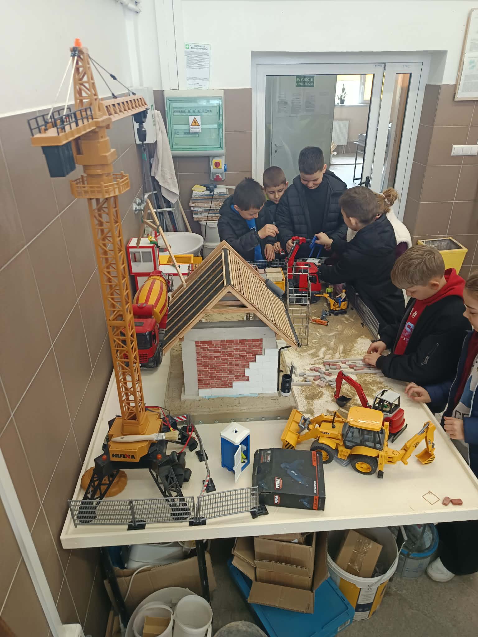 Następnie nasi goście wyruszyli na zwiedzanie szkolnych pracowni. Odwiedzili warsztaty, gdzie o odnawialnych źródłach energii opowiedział Pan Dyrektor Fejdasz. W pracowni budowlanej pan Michał Pieniążek zaprezentował imponujący miniaturowy plac budowy, który wzbudził duże zainteresowanie wśród uczniów.